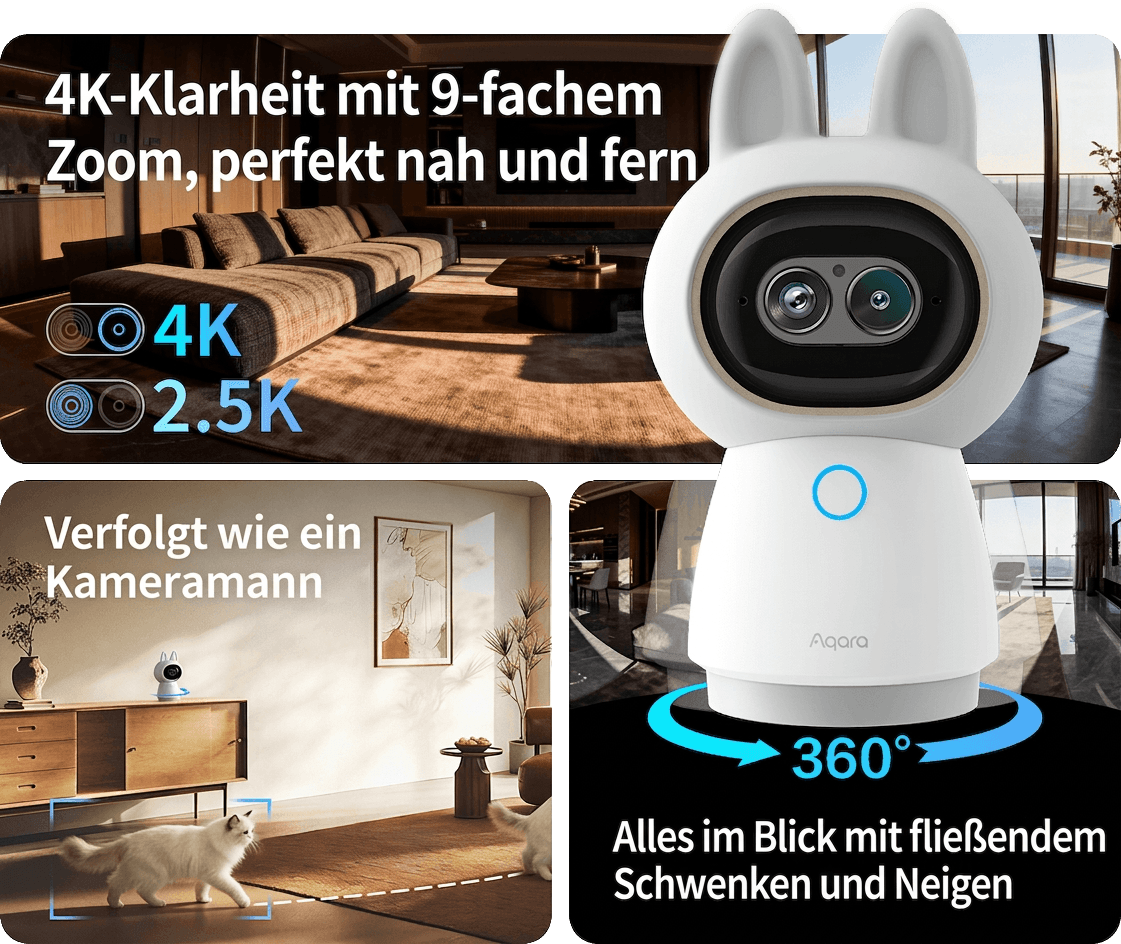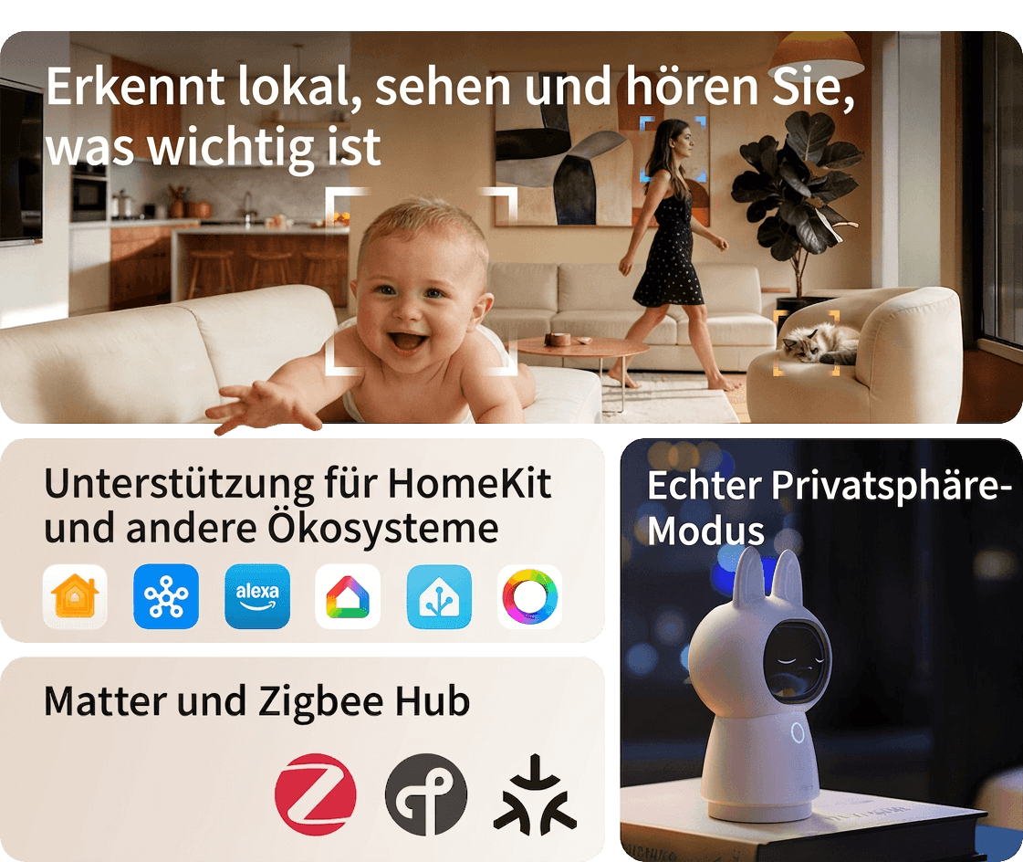 Diese Kamera fungiert gleichzeitig als leistungsstarker Aqara Zigbee-Hub und Matter-Controller sowie als Bridge, die Ihre Aqara-Geräte mit wichtigen Ökosystemen verbindet und gleichzeitig Matter-Geräte von Drittanbietern in Aqara Home integriert, für eine einheitliche, zukunftssichere Steuerung.