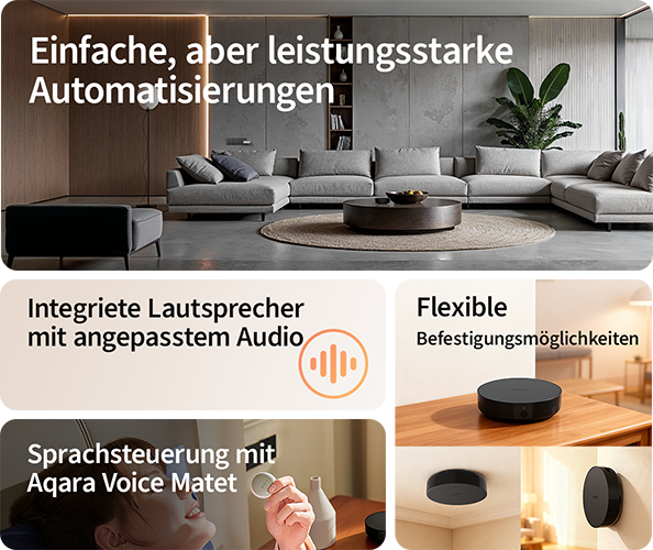 Der 360° IR-Blaster* sendet Befehle und kann erkennen, wenn Ihre vorhandene Fernbedienung verwendet wird, wodurch genaue Statusaktualisierungen gewährleistet werden. Er kann auch IR-basierte Klimaanlagen mit Matter** verbinden und ermöglicht eine thermostatähnliche Funktionalität, wenn er mit einem Aqara Klimasensor verwendet wird. Für einen zuverlässigen Betrieb empfehlen wir Ihnen, den Hub in der Nähe der Klimaanlage zu installieren.