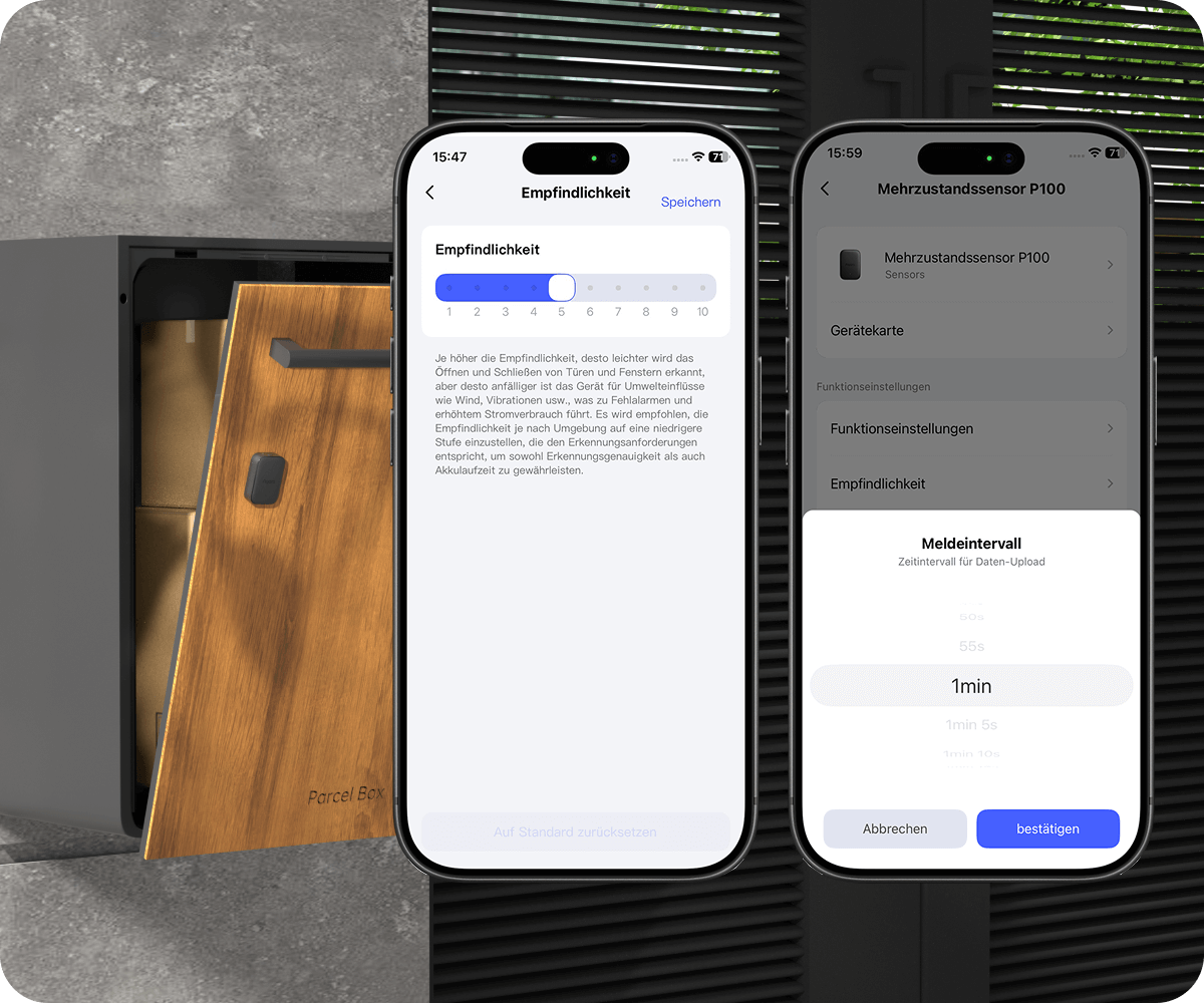 Erkennt Vibration oder Neigung, wenn Post oder Pakete zugestellt werden, sodass Sie im Moment der Ankunft informiert werden.