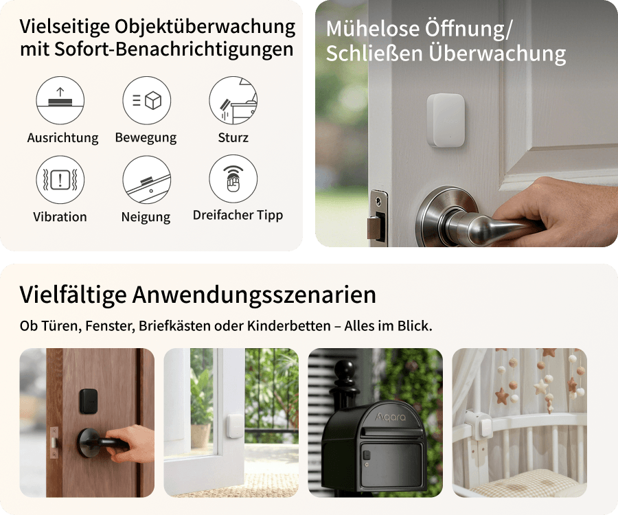 Von Scharniertüren bis hin zu Kipp- und Verbundfenstern, dieser Sensor ist mit gängigen Haushaltsöffnungen kompatibel und lässt sich flexibel an Kühlschränken, Tresoren und anderen beweglichen Objekten einsetzen.