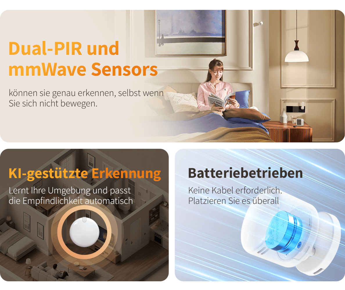- Sensor lernt und passt automatisch seine Detektionsempfindlichkeit an, um sich an Ihre Umgebung anzupassen.