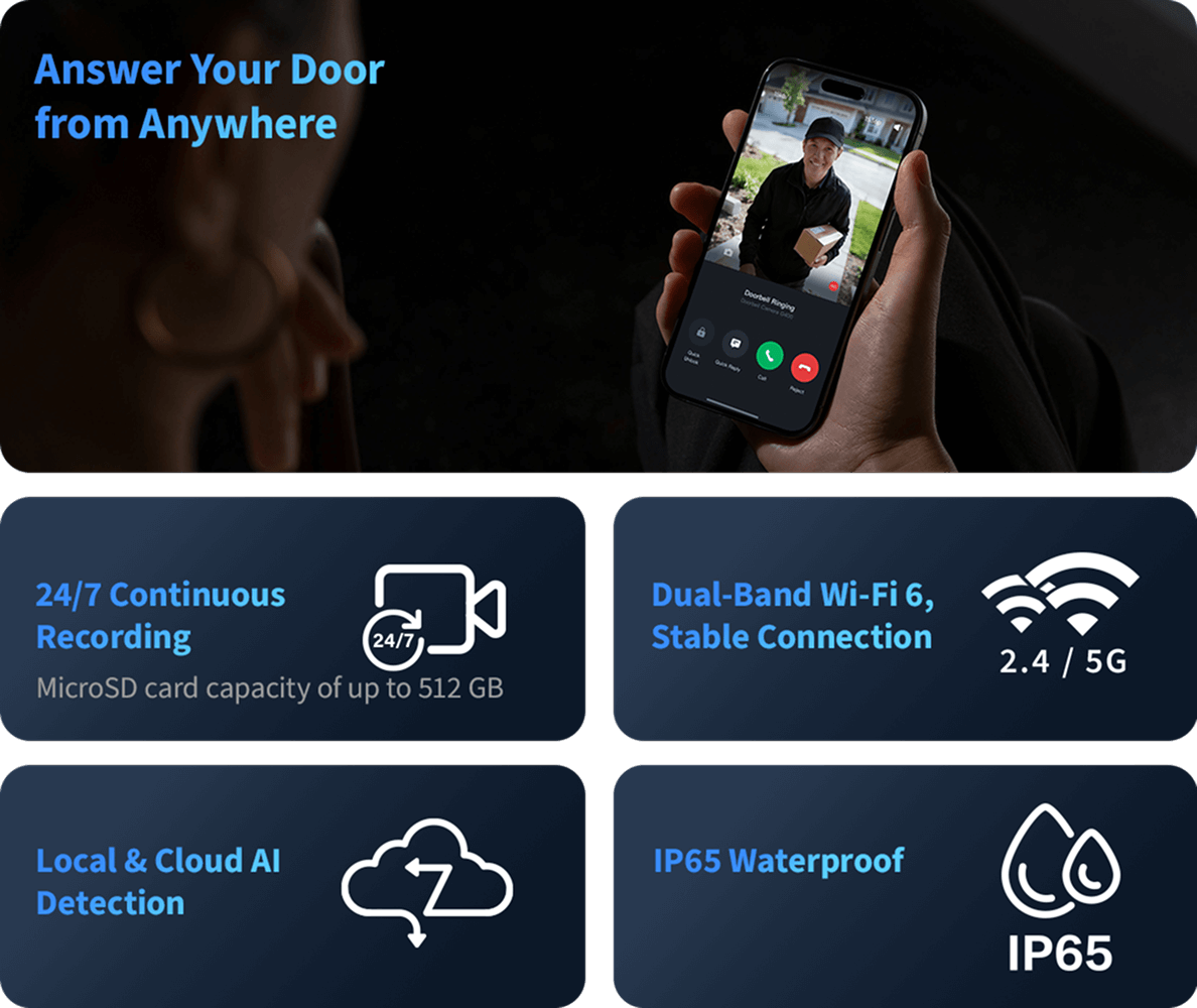 With a microSD card of up to 512 GB, the doorbell camera offers 24/7 continuous recording.