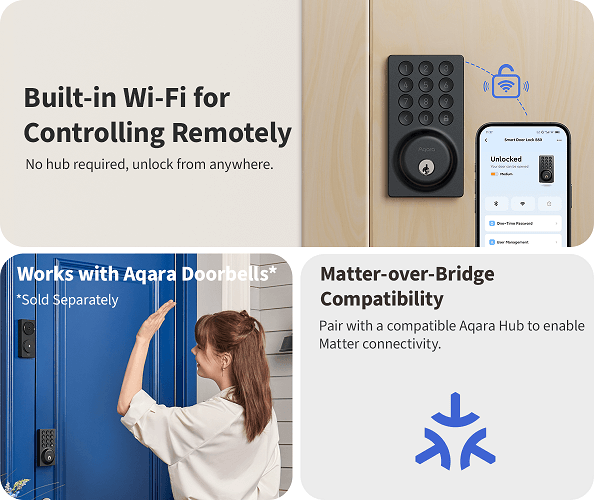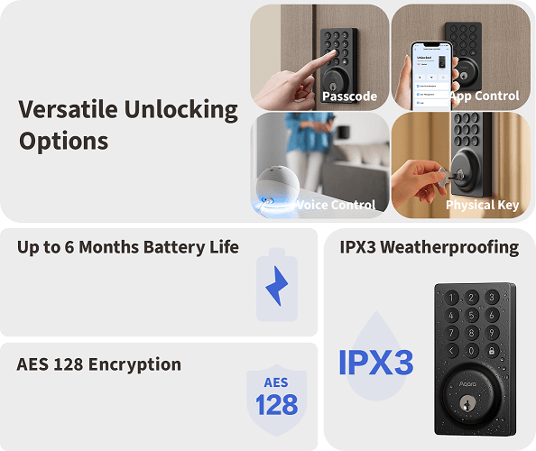 With built-in Wi‑Fi 6 and no bridge required, you can lock, unlock, and view lock activity and status anytime and anywhere using the Aqara Home app, Alexa, or Google Home.