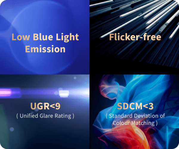 Flicker-free lighting with low blue light hazard, no flicker, and UGR<9 for reduced glare. Furthermore, its SDCM<3 color accuracy ensures lifelike colors, protecting your vision in any environment.