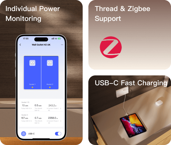 Smart two-socket outlet featuring USB-C fast charging, Thread/Zigbee connectivity, and precise power monitoring.