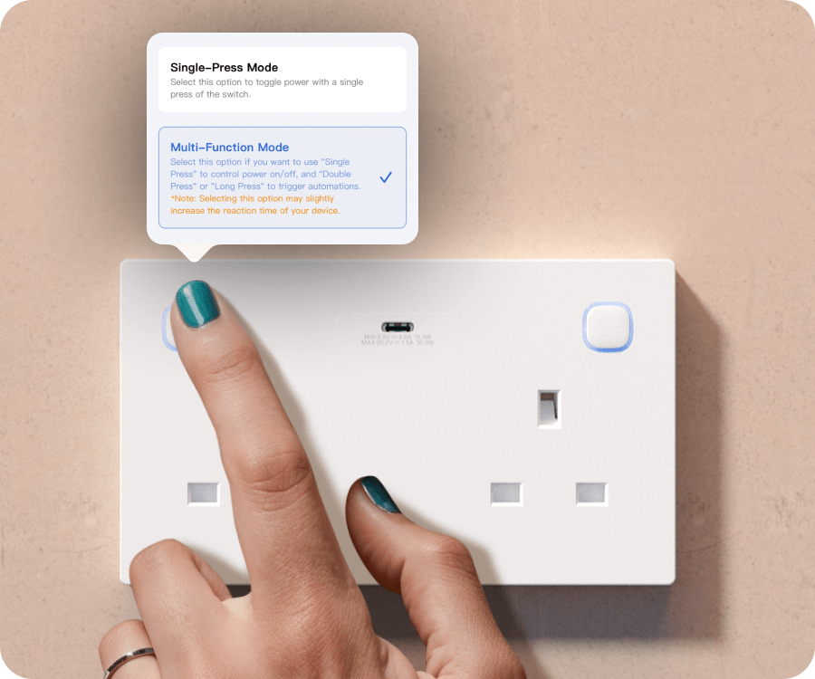 - Multi-Function Mode: A single press turns on/off the outlet. A double-press or long-press can trigger custom scenes, like dimming the lights for a movie night.